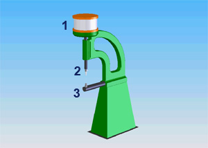 1 – Cilindro Pneumático. 2 – Bico. 3 – Suporte. Operações realizadas: - Rebitar panelas de pressão e comum e outros utensílios de alumínio polido ou antiaderente. /p>